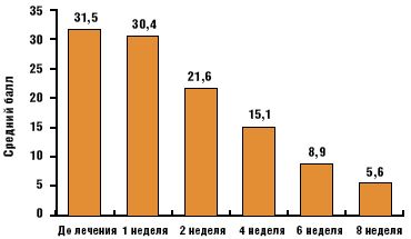 По данным, представленным на рис. 4, можно сделать вывод, что в процессе лечения имела место неуклонная редукция тревожных расстройств и к концу исследования выраженность тревоги (оценка по шкале Спилбергера) не отличалась от таковой в контрольной группе (p > 0,05). Достоверное уменьшение тревожных расстройств отмечено уже к концу первой недели терапии (р < 0,05), что субъективно оценивалось пациентами как положительная динамика состояния. Однако значимое клиническое улучшение («выраженное» и «существенное» улучшение по шкале CGI) констатировано лишь на четвертой неделе лечения (рис. 5).